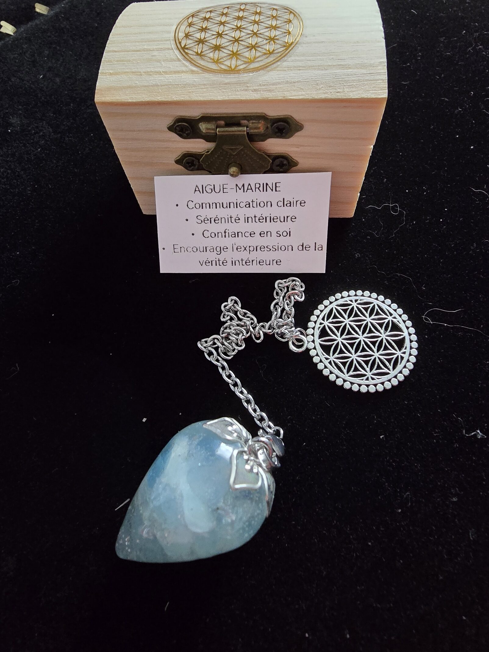 - Matériau : Fabriqué en aigue-marine authentique, connue pour ses teintes bleu clair et ses propriétés apaisantes.