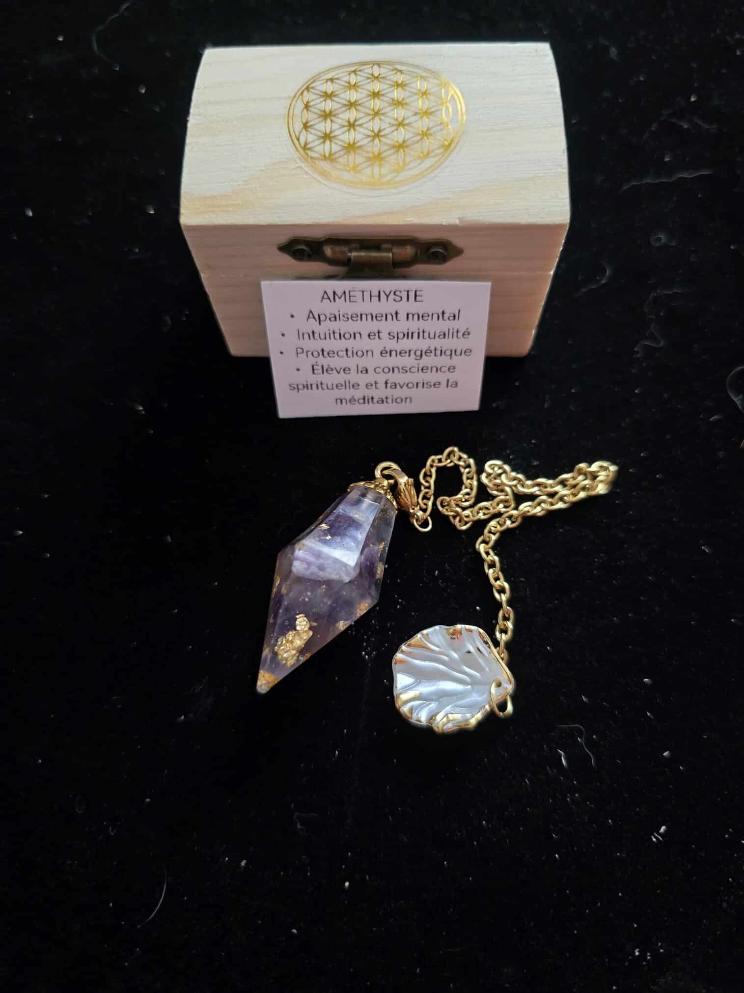 L’améthyste est réputée pour calmer les tensions, stimuler l’intuition et harmoniser les énergies. Ce pendule vous accompagne dans vos recherches intérieures, vos pratiques méditatives ou vos moments de contemplation.